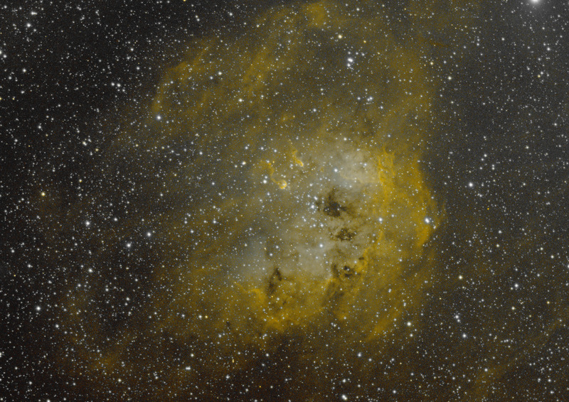 (Click to enlarge) This image © Copyright 2018, Michael Fulbright Bicolor narrow band preview for IC410 William Optics 66 SD + 0.8x reducer (320mm) SXV-H9 CCD Baader Ha + OIII filters Mix of Ha->Red, Ha/OIII blend->Green, OIII->Blue Date: 12/17/2014